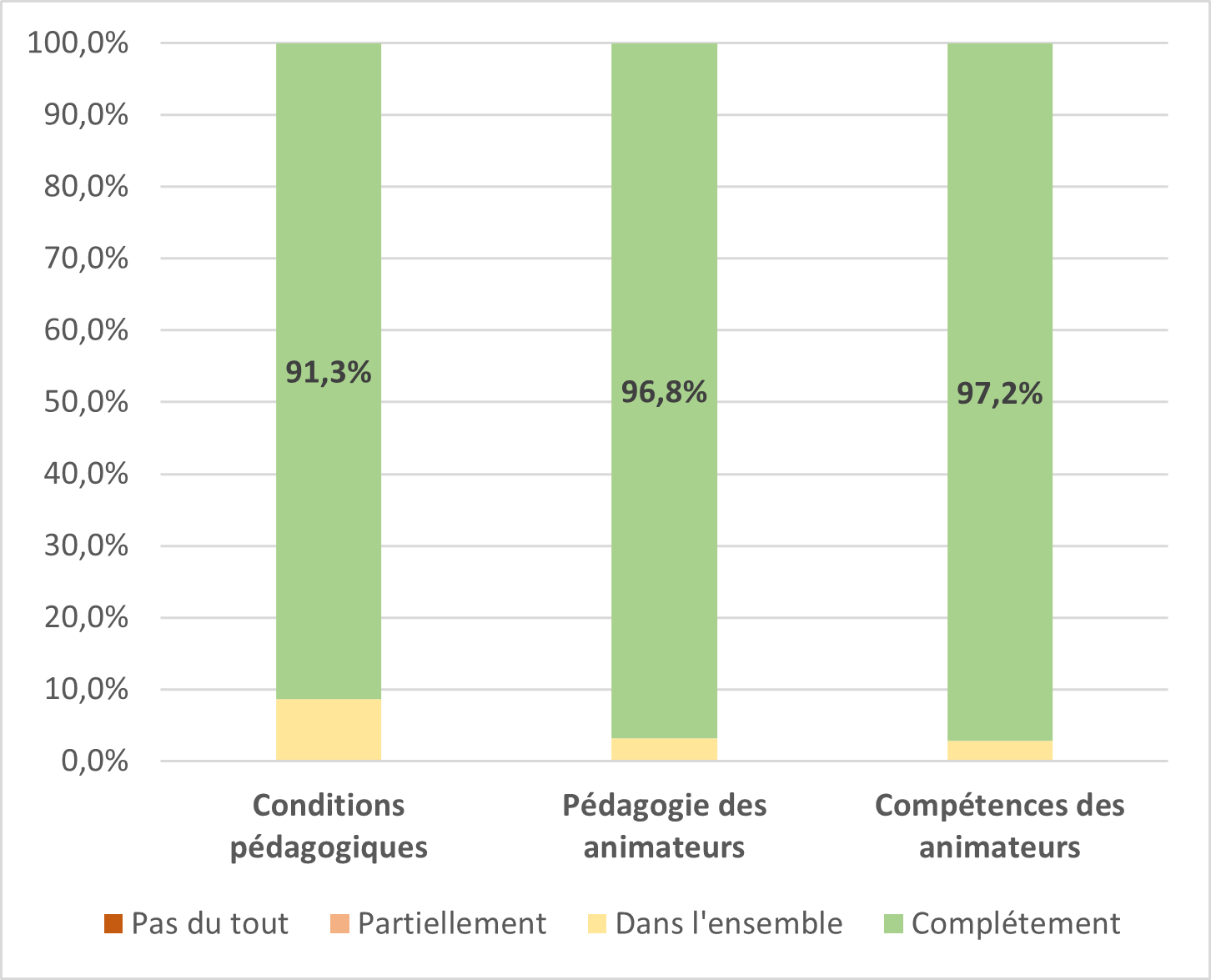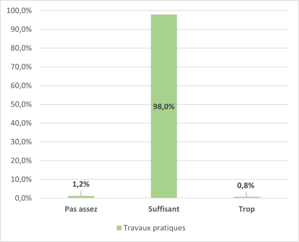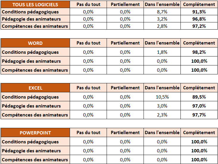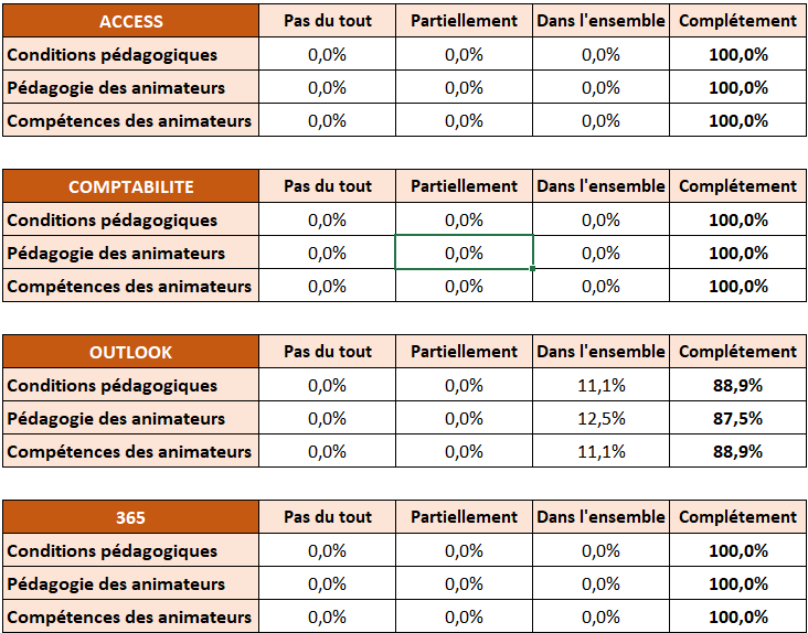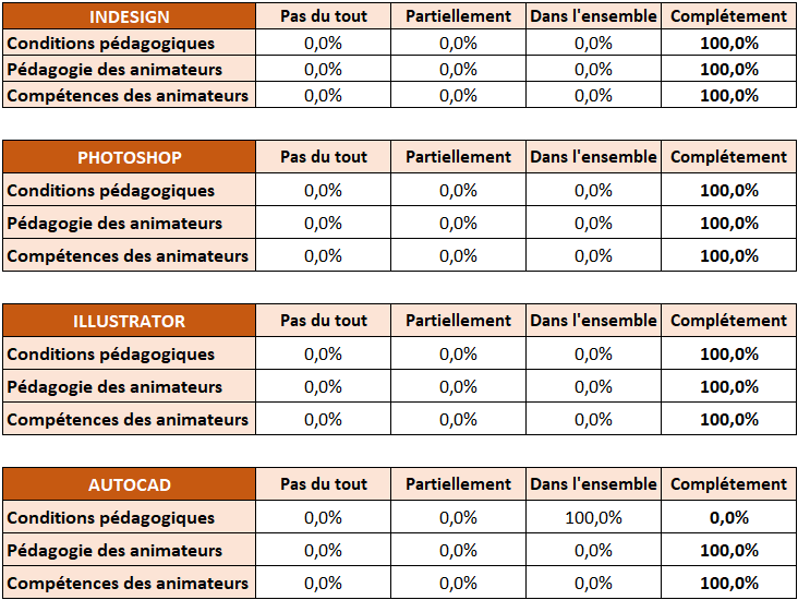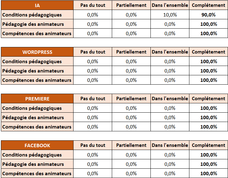 En fin de chaque stage, les stagiaires remplissent un questionnaire informatique pour évaluer la qualité de la formation (Conditions pédagogiques, Compétences et pédagogies des formateurs…) selon plusieurs niveaux de satisfaction :